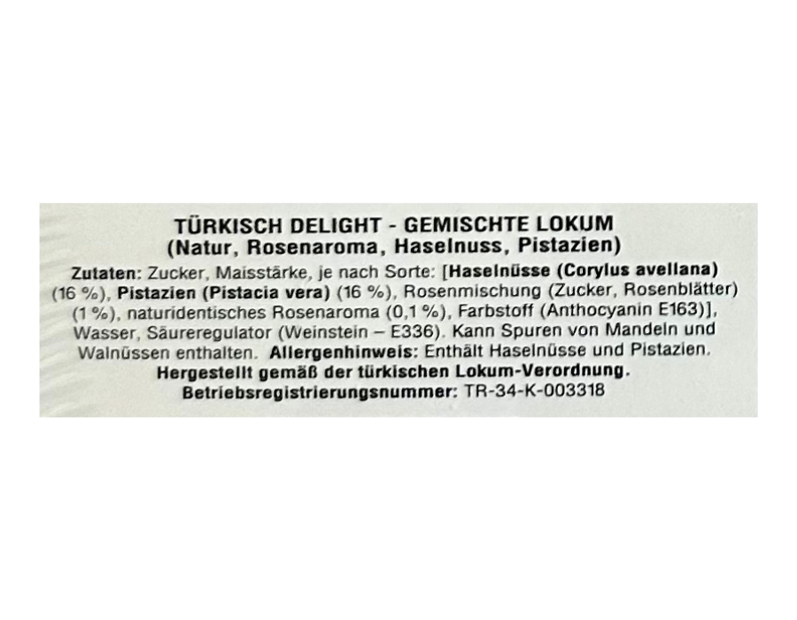 HACIBEKIR Premium Lokum mit türkischen Pistazien 200 g Nettogewicht: 200 gram Mit türkische Pistazien und Granatapfelaroma Hergestellt in der Türkei Durch der traditonsmarke Haci Bekir seit 1777 Nährwerte: 100 g icin kalori / Calories pour 100 g / Kalorien pro 100 g: 412 kcal Her servis için kalori / Calories par portion / Kalorien pro Portion / Calorieen per portie: 165 kcal Yagdan gelen kalori / Calories provenant des graisses / Kalorien aus Fett / Calorien uit vet: 29,7 kcal Toplam yag / Graisses totales / Gesamtfett / Totale vet: 3,3 g Sodyum / Sodium / Natrium / Natrium: 1,2 mg Toplam karbonhidrat / Glucides totaux / Gesamtkohlenhydrate / Totale koolhydraten: 32,1 g Selüloz / Fibres / Ballaststoffe / Vezels: 0,43 g Seker / Sucres / Zucker / Suikers: 25,6 g ilave seker / Contient de sucres ajoutés / Enthält zugesetzten Zucker / Bevat toegevoegde suikers: 0 g Protein / Protéines / Eiweiß / Eiwit: 1,6 g Kalsiyum / Calcium / Kalzium / Calcium: 2,4 mg Potasyum / Potassium / Kalium / Kalium: 13,2 mg * Percent Daily Values are based on a 2,000 calori diet.