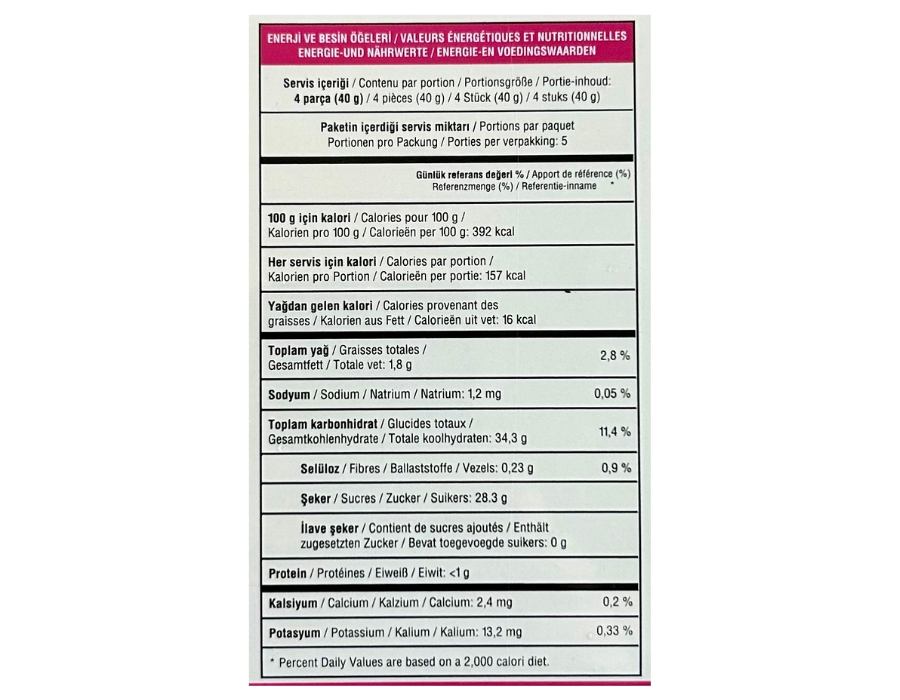 HACI BEKIR Premium Lokum mit Rosen Aroma 200 g Nettogewicht: 200 gram Mit Rosen Aroma Hergestellt in der Türkei Durch der traditonsmarke Haci Bekir seit 1777 Nährwerte: 100 g icin kalori / Calories pour 100 g / Kalorien pro 100 g: 357 kcal Her servis için kalori / Calories par portion / Kalorien pro Portion / Calorieen per portie: 143 kcal Yagdan gelen kalori / Calories provenant des graisses / Kalorien aus Fett / Calorien uit vet: 3 kcal Toplam yag / Graisses totales / Gesamtfett / Totale vet: 0,3 g Sodyum / Sodium / Natrium / Natrium: 0,1 mg Toplam karbonhidrat / Glucides totaux / Gesamtkohlenhydrate / Totale koolhydraten: 35,7 g Selüloz / Fibres / Ballaststoffe / Vezels: 0 g Seker / Sucres / Zucker / Suikers: 29,7 g ilave seker / Contient de sucres ajoutés / Enthält zugesetzten Zucker / Bevat toegevoegde suikers: 0 g Protein / Protéines / Eiweiß / Eiwit: <1 g Kalsiyum / Calcium / Kalzium / Calcium: 3,9 mg Potasyum / Potassium / Kalium / Kalium: 13,2 mg * Percent Daily Values are based on a 2,000 calori diet.