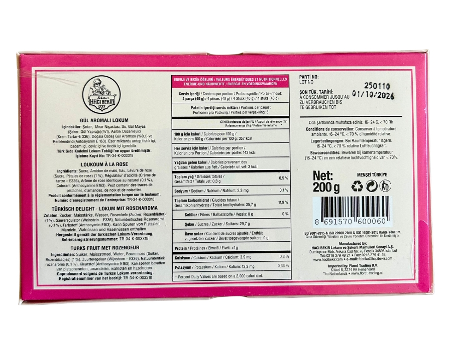 HACI BEKIR Premium Lokum mit Gemischten Aromen 200 g Nettogewicht: 200 gram Mit 4 Sorten: Natur - Ohne Aroma, Rosen Aroma, mit türkischen Hazelnüssen und mit Pistazien. Hergestellt in der Türkei Durch der traditonsmarke Haci Bekir seit 1777 Nährwerte: 100 g icin kalori / Calories pour 100 g / Kalorien pro 100 g: 392 kcal Her servis için kalori / Calories par portion / Kalorien pro Portion / Calorieen per portie: 157 kcal Yagdan gelen kalori / Calories provenant des graisses / Kalorien aus Fett / Calorien uit vet: 16 kcal Toplam yag / Graisses totales / Gesamtfett / Totale vet: 1,8 g Sodyum / Sodium / Natrium / Natrium: 1,2 mg Toplam karbonhidrat / Glucides totaux / Gesamtkohlenhydrate / Totale koolhydraten: 34,3 g Selüloz / Fibres / Ballaststoffe / Vezels: 0,23 g Seker / Sucres / Zucker / Suikers: 28,3 g ilave seker / Contient de sucres ajoutés / Enthält zugesetzten Zucker / Bevat toegevoegde suikers: 0 g Protein / Protéines / Eiweiß / Eiwit: <1 g Kalsiyum / Calcium / Kalzium / Calcium: 2,4 mg Potasyum / Potassium / Kalium / Kalium: 13,2 mg * Percent Daily Values are based on a 2,000 calori diet.