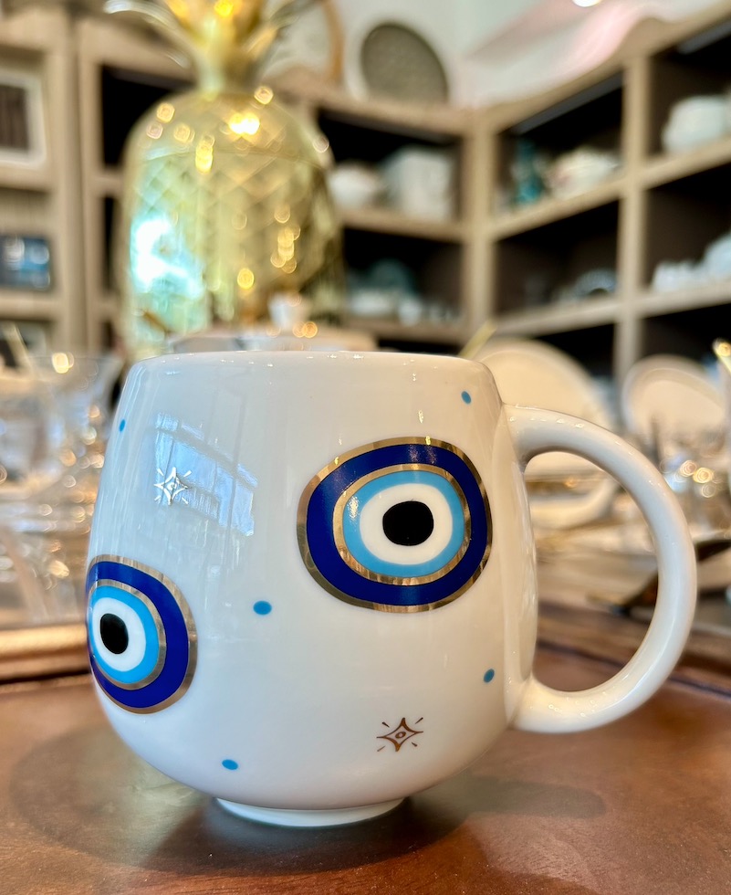NAZAR Design Kaffeebecher Mit "Blaues Auge (Nazar Boncugu)" Design Größe: 7,5 x 9,5 cm Kapazität: 450 ml Farbe: Weiß - Blau - Gold 1x Kaffeebecher In der Geschenkverpackung Material: Porzellan Serie: Nazar Nazar-Amulette sind in einigen orientalischen Ländern verbreitete blaue, augenförmige Amulette, die gemäß dem Volksglauben den Bösen Blick abwenden sollen. Der Begriff kommt ursprünglich vom arabischen Ausdruck Nazar / نظر / Naẓar, was u. a. für Sehen, Blick, Einsicht steht. Im Türkischen bezeichnet nazar boncuğu das Nazar-Amulett bzw. wörtlich die Blick-Perle, ebenfalls gebraucht werden die Begriffe mavi boncuk (Blaue Perle), oder göz boncuğu (Augen-Perle) Quelle: Wikipedia