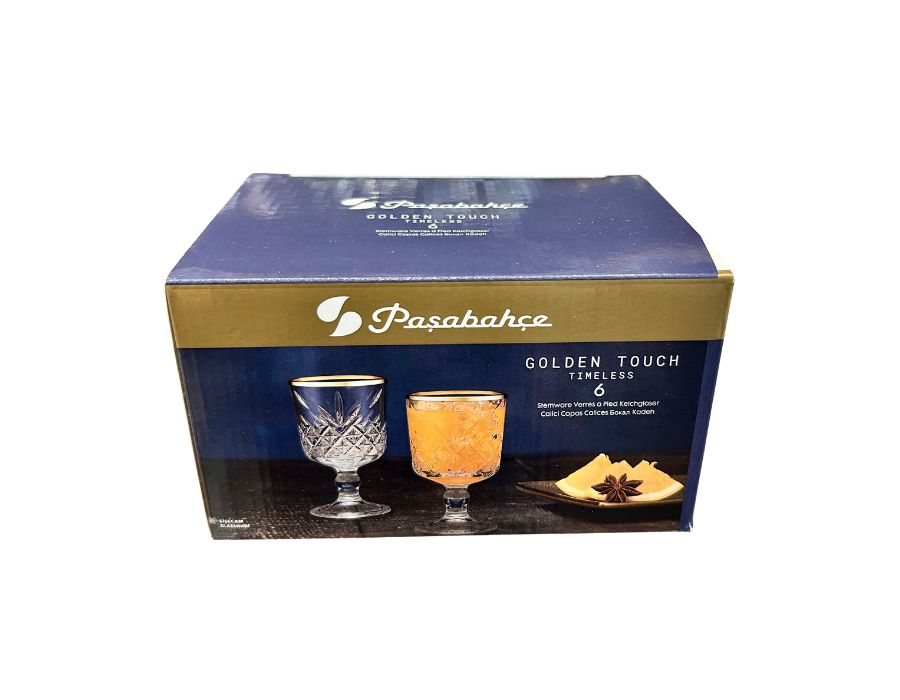 Pasabahce TIMELESS GOLD Gläser 4 x Gläser Mit vergoldeten Bordüren Kapazität: 345 ml Höhe: 9,6 cm Durchmesser: 8,5 cm Modell: TIMELESS Golden Touch Marke: Pasabahce Material: Glas