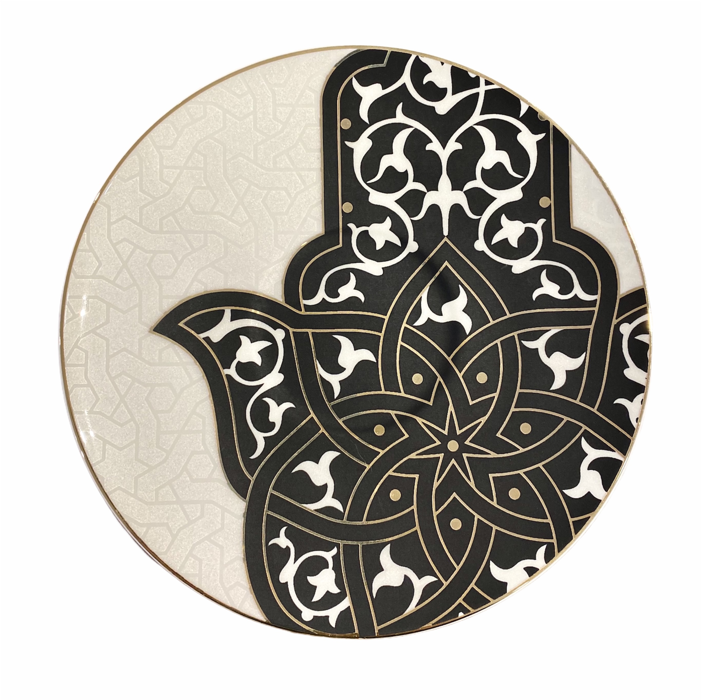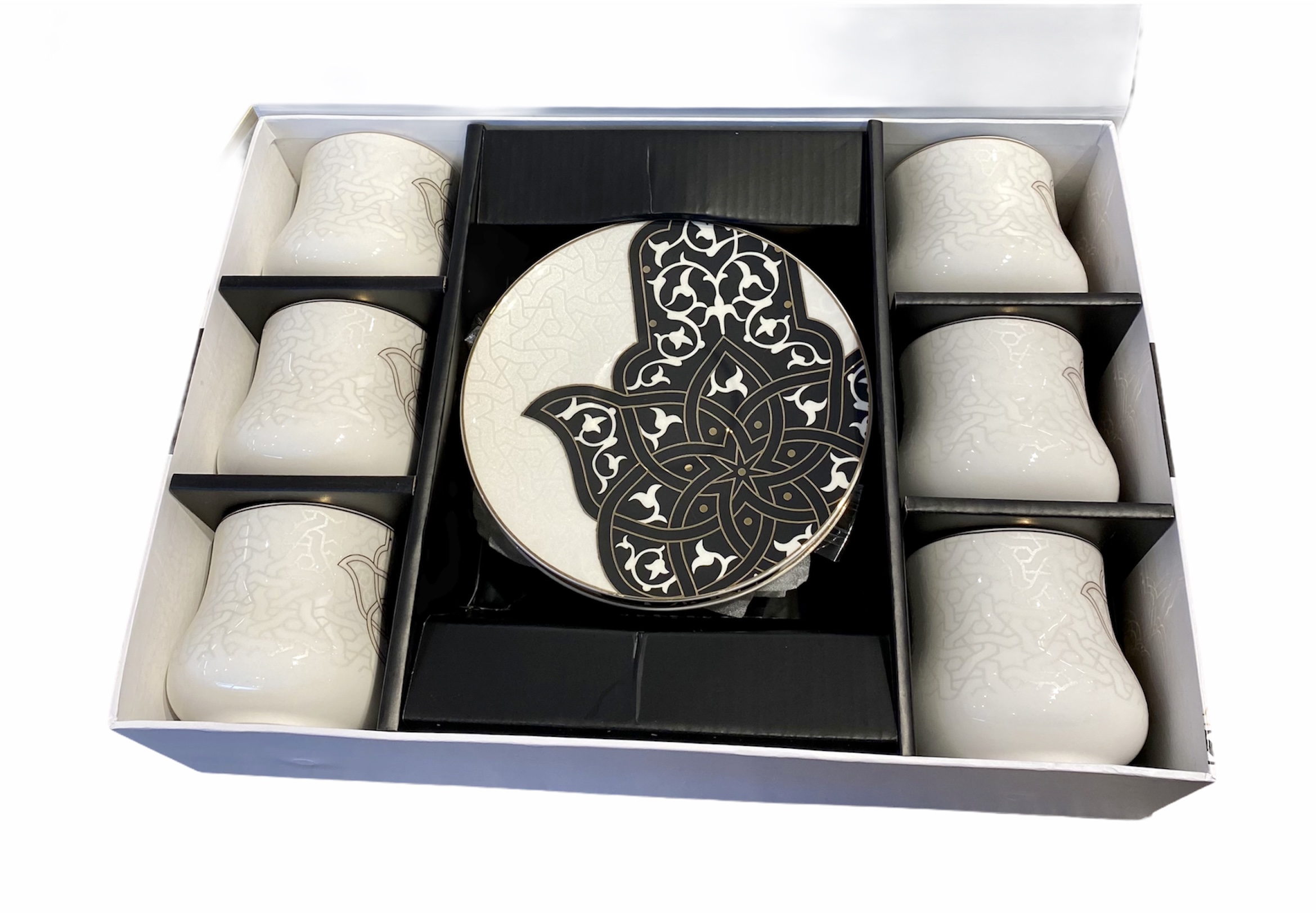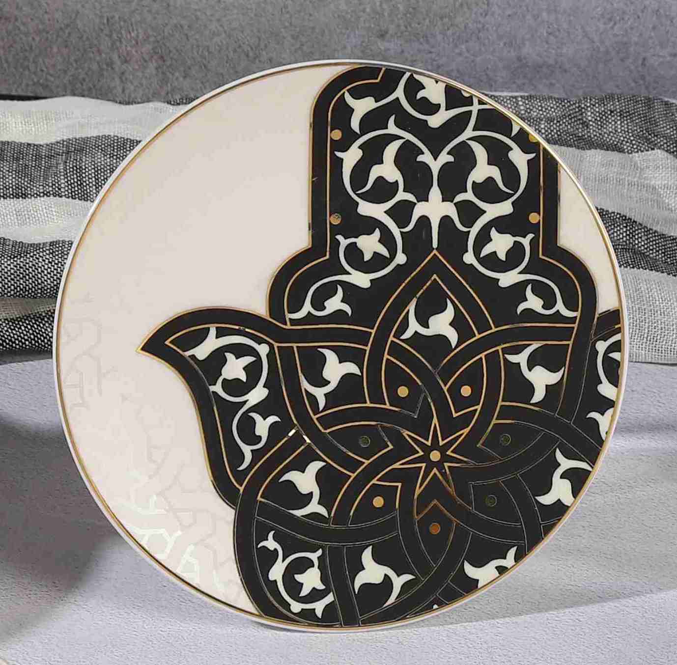 ANCIENT Design Mokkatassen Espressotassen Set Schwarz-Weiß 12-teilig Farbe Schwarz Weiss Kapazität: ca. 95 ml 6x Mokkatssen und 6x Untersetzer Motiv: Hand der Fatima (auch Hamsa) Die Hand der Fatima ist ein kulturelles Zeichen im islamischen Volksglauben Nordafrikas und des Nahen Ostens. Es gilt als universell schützend und als wirksamste Abwehrmaßnahme im Kampf gegen die Dschinn und den Bösen Blick. In der Geschenkverpackung Material: Premium Porzellan Serie: Ancient