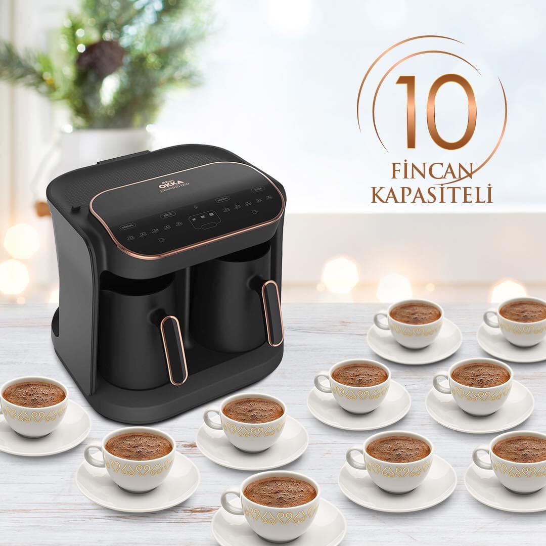 Arzum Okka DUO 8-Tassen Mokka-Maschine Ein türkisches Sprichwort besagt: " An eine Tasse Kaffee kann man sich noch 40 Jahre lang erinnern." Farbe: Schwarz-Kupfer Modell: Okka DUO Modellnummer: OK006 1-8 Tassen Kapazität - mit 2 Kannen Maximale Leistung: 880 Watt - je Kanne 440 Watt Kocherkennungssensor IntelBrew OverFlow Preventionsystem Beidseitige Auslauföffnung Messlöffel inklusive Deutsche Version, Stecker 2-Polig (EU) Original Mokka in wenigen Minuten, schnell und einfach zubereitet Einfach zu bedienen Lieferumfang: Mokka-Maschine mit Stromkabel, 2xBrühbehälter, Messlöffel und Bedienungsanleitung Geschenkaktion: 100g Türkischer Mokka Kaffee von PALA EFENDI gratis dazu.