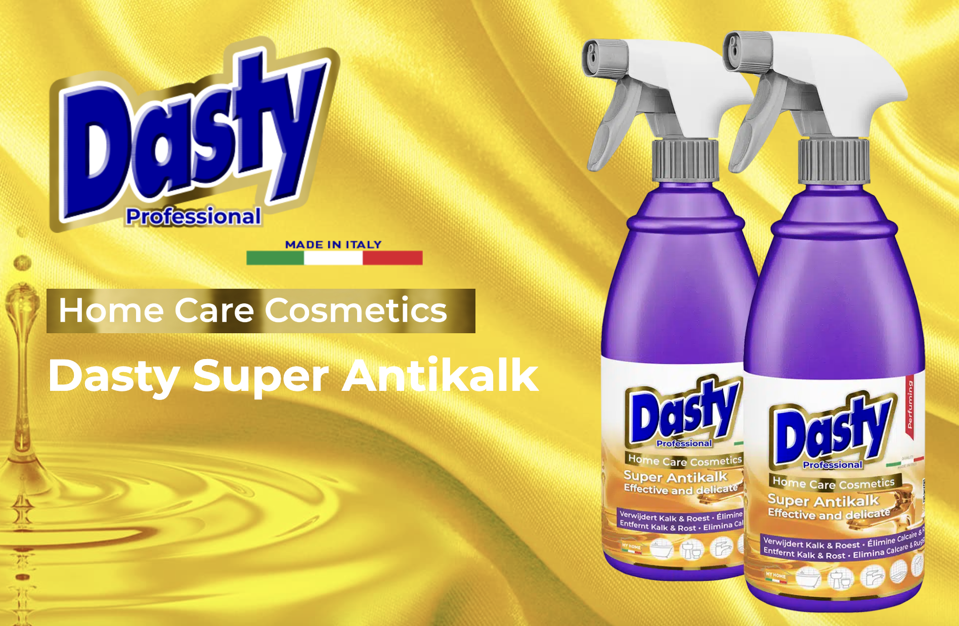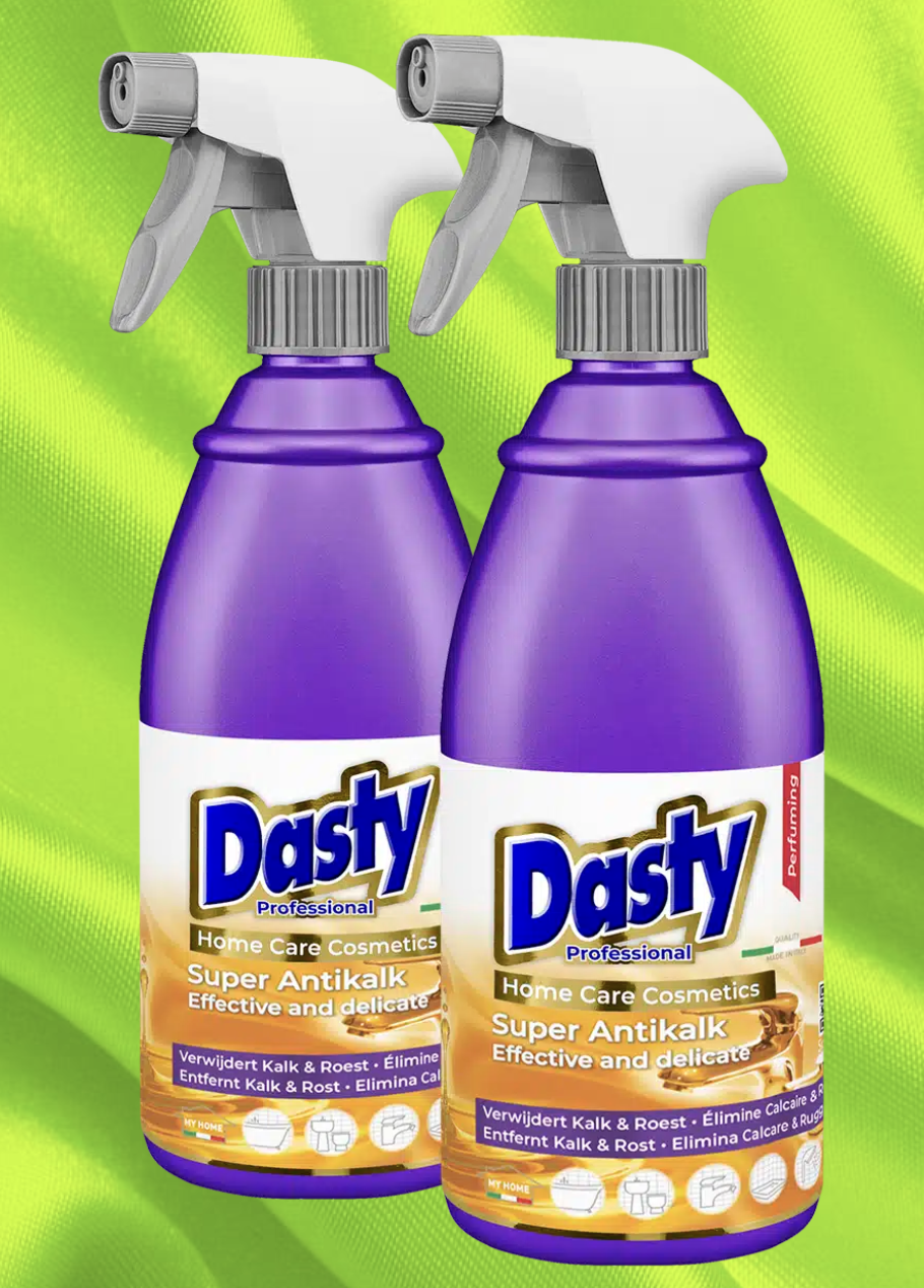 DASTY SUPER ANTIKALK entfernt Kalk von allen Badezimmerarmaturen und der Küchenspüle. Wirksam und schonend, greift das Chrom nicht an und wirkt auch gegen Rost. Sein intensiver Duft hinterlässt ein fantastisches Gefühl von Sauberkeit, das lange anhält. Täglich auch in der Duschkabine verwendet, vermeidet es Kalkablagerungen und hält die Oberflächen glänzend. Dasty Super Antikalk, eine echte Kosmetik für Ihr Zuhause.