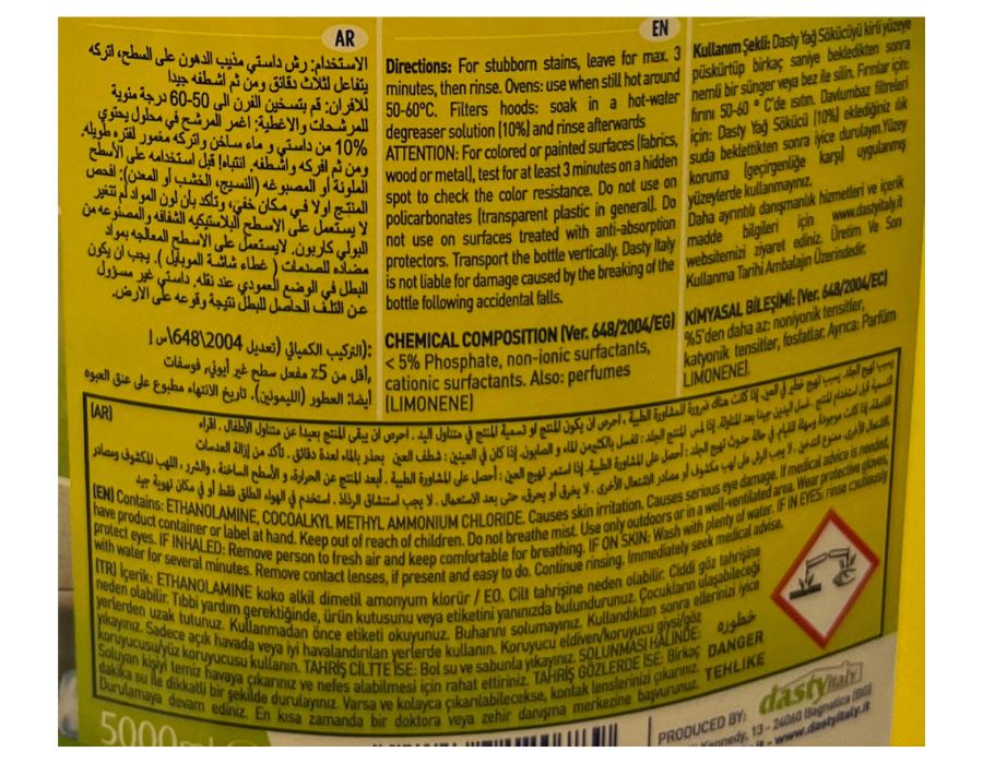 DASTY Classic Fettlöser Entfetter 5 Liter Kanister Nachfüllpack Nachfüllpack: 5 Liter Kanister Premium Fettlöser Marke: Dasty Produktvolumen: 5 Liter DASTY CLASSIC DEGREASER, der originale Universal-Entfetter, ist die ideale Lösung innerhalb und außerhalb des Hauses, in der Garage und im Garten: Spülbecken, Öfen, Kochfelder, Dunstabzugshauben, Grills, Böden, Geschirr (Vorbehandlung) u.s.w., sowie bei vielen anderen schwierigen Flecken.´ Wie zu verwenden Bei hartnäckigen Flecken höchstens 3 Minuten einwirken lassen und dann ausspülen. Backöfen: Einsatz bei Temperaturen von max. 40-50 °C bei Filtern von Abzugshauben und mechanischen Teilen: in einer Schüssel auf 50 % verdünnen, die zu reinigenden Teile eintauchen, max. 10 min einwirken lassen ausspülen. Empfehlungen Bei farbigen oder lackierten Oberflächen mindestens 3 Minuten in einer versteckten Ecke testen, um die Farbechtheit zu prüfen. Nicht auf Polycarbonat (allgemein transparenter Kunststoff) verwenden. Nicht auf Oberflächen verwenden, die mit Absorptionsschutz behandelt wurden, oder auf undurchsichtigen Oberflächen. Sicherheitshinweise: Hände nach Gebrauch gründlich waschen Außerhalb der Reichweite von Kindern aufbewahren Nicht einnehmen oder trinken Menschen mit Hautallergien sollten einen verlängerten Hautkontakt vermeiden Nicht mit den Augen in Kontakt kommen lassen Schutzhandschuhe/Schutzkleidung/Augenschutz/Gesichtsschutz tragen. Einatmen von Staub/Rauch/Gas/Nebel/Dampf/Aerosol vermeiden. Nur im Freien oder in gut belüfteten Räumen verwenden. INHALTSSTOFFE: Ethanolamine, Cocoalkyl, Methyl Ammonium Chloride / EO. CHEMISCHE ZUSAMMENSETZUNG: (Ver.648/2004/EG) Weniger als 5% nichtionische und kationische Tenside, Phosphate, Außerdem: Duftstoffe (Limone)