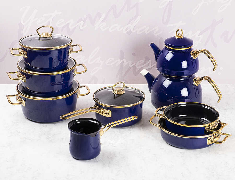 Emaille Saucenpfanne Blau-Gold 16 cm mit Glasdeckel Induktion TantiToni