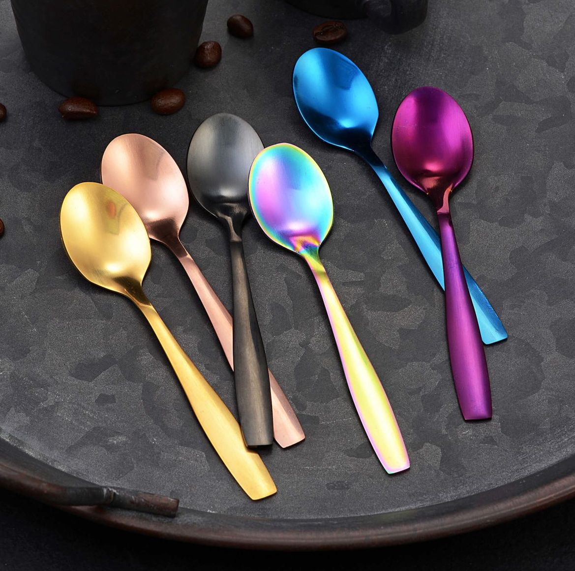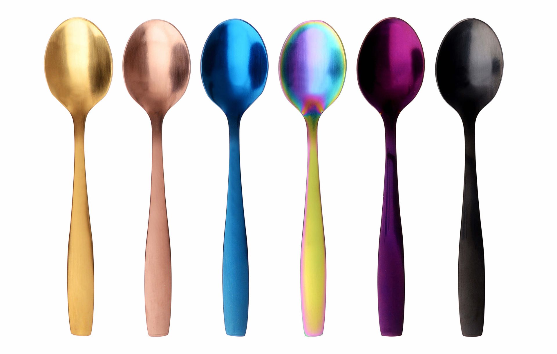 - Dieses bunte Set besteht aus sechs Löffeln in den lebendigen Farben Gold, Rotgold, Schwarz, Regenbogen, Blau und Lila, die Ihre Kaffeemomente zu etwas Besonderem machen.