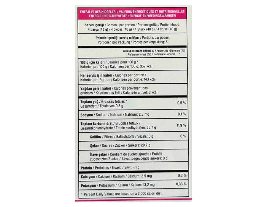HACI BEKIR Premium Lokum mit Gemischten Aromen 200 g Nettogewicht: 200 gram Mit 4 Sorten: Natur - Ohne Aroma, Rosen Aroma, mit türkischen Hazelnüssen und mit Pistazien. Hergestellt in der Türkei Durch der traditonsmarke Haci Bekir seit 1777 Nährwerte: 100 g icin kalori / Calories pour 100 g / Kalorien pro 100 g: 392 kcal Her servis için kalori / Calories par portion / Kalorien pro Portion / Calorieen per portie: 157 kcal Yagdan gelen kalori / Calories provenant des graisses / Kalorien aus Fett / Calorien uit vet: 16 kcal Toplam yag / Graisses totales / Gesamtfett / Totale vet: 1,8 g Sodyum / Sodium / Natrium / Natrium: 1,2 mg Toplam karbonhidrat / Glucides totaux / Gesamtkohlenhydrate / Totale koolhydraten: 34,3 g Selüloz / Fibres / Ballaststoffe / Vezels: 0,23 g Seker / Sucres / Zucker / Suikers: 28,3 g ilave seker / Contient de sucres ajoutés / Enthält zugesetzten Zucker / Bevat toegevoegde suikers: 0 g Protein / Protéines / Eiweiß / Eiwit: <1 g Kalsiyum / Calcium / Kalzium / Calcium: 2,4 mg Potasyum / Potassium / Kalium / Kalium: 13,2 mg * Percent Daily Values are based on a 2,000 calori diet.