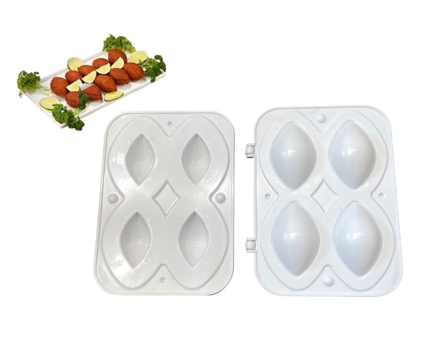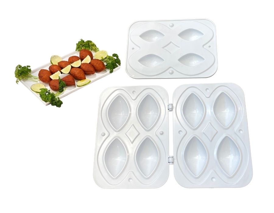 HÜMA Icli Köfte Form Kibbeh Form Weiß (Gefüllte Bulgurbällchen) 4er Form Spezielle Form um Kibbeh / Icli Köfte (Gefüllte Bulgurbällchen) einfach zu machen Farbe: Weiß Größe Gesamt Augeklappt: ca. 22 x 33 cm Größe Einzelner Form: 4,5 x 8 cm Material: Kunststoff - BPA-Frei