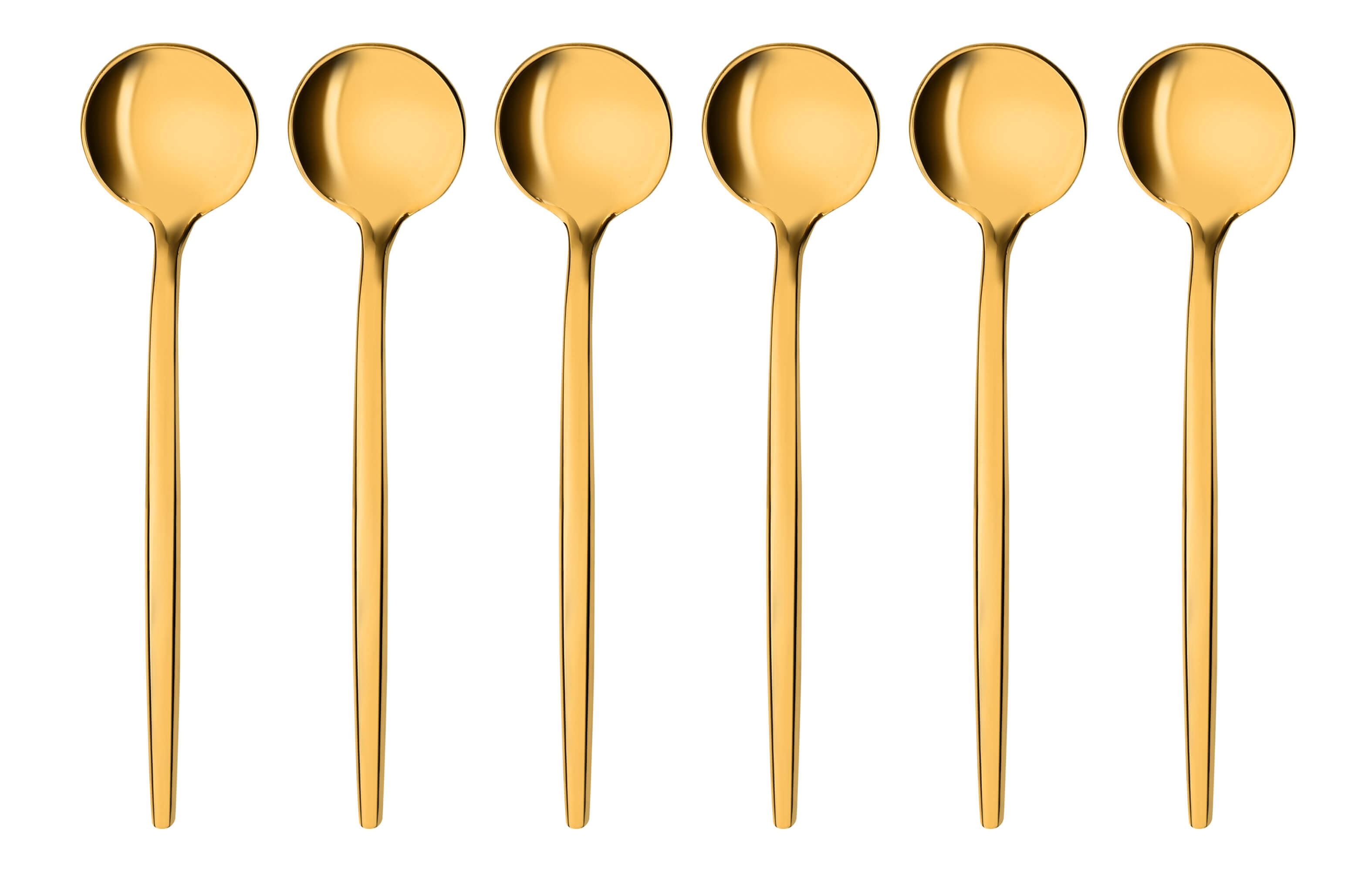 Espressolöffel Teelöffel PROVENCE gold 6 Stück Goldene Espressolöffel für stilvollen Genuss Dezentes Dekor Material: Edelstahl 18/0 (Chromstahl) Farbe: Gold Spülmaschinengeeignet Lieferumfang: 6 Espressolöffel Gesamtlänge: ca. 13 cm Gesamtbreite: ca. 2,5 cm