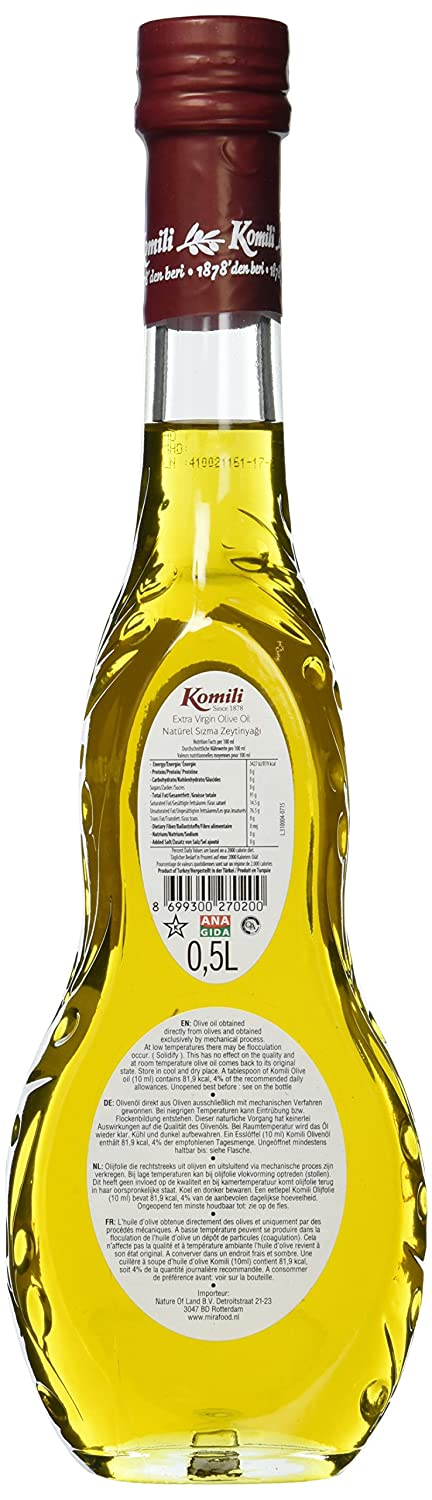 - KOMILI Natives Olivenöl Extra ist in gewisser Weise wie der Saft des unsterblichen Olivenbaums. Es ist die natürlichste und aromatischste Form von Olivenöl, die die Gesundheit der Natur auf unsere Tische bringt. Sie können Komili Extra Natives Olivenöl, das wir Ihnen mit den hohen Qualitäts- und Kontrollstandards von Komili, einer der besten Oliven der Ägäis anbieten, in all Ihren Mahlzeiten genießen, insbesondere in Vorspeisen, Salaten und Gegrilltem , um seinen intensiven, aromatischen Geschmack besser genießen zu können.