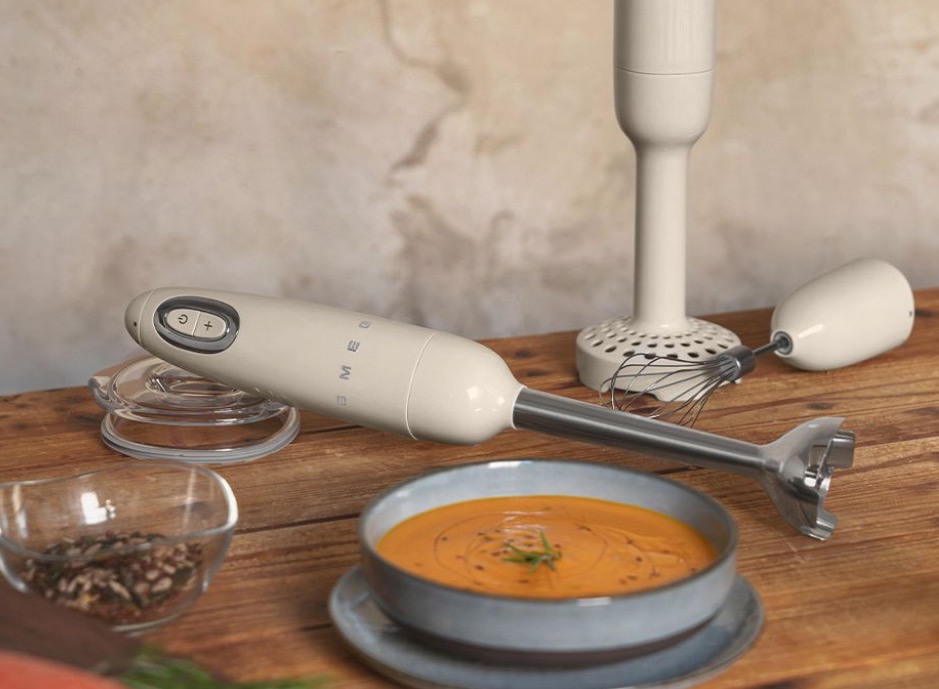SMEG Stabmixer CREME 50's Style HBF11CREUFarbe: CREME Variable Geschwindigkeit und Turbofunktion für perfekte ErgebnisseErgonomischer Anti-Rutsch-Griff für eine einfache HandhabungKlingen aus rostfreiem Stahl mit FlowBlend-System für die besten ErgebnisseLieferumfang: nur der Stabmixer in der Geschenkbox - ohne Zubehör.Eigenschaften:Klingensystem: FlowBlend™-TechnologieMax. Geschwindigkeit: 14850 U/min Min. Geschwindigkeit: 8150 U/minBefestigungssystem für Zubehör: Twist & Lock-VerschlussRutschfeste Soft-Touch-Einlage beim Handgriff: JaOhne Netzkabel-Aufwicklung: JaAbmessungen Stabmixer: HxBxT: 414x65x65 mmSpannung: 220-240 VFrequenz: 50-60 HzMax. Leistungsaufnahme: 700 WLänge des Netzkabels: 1.5 m
