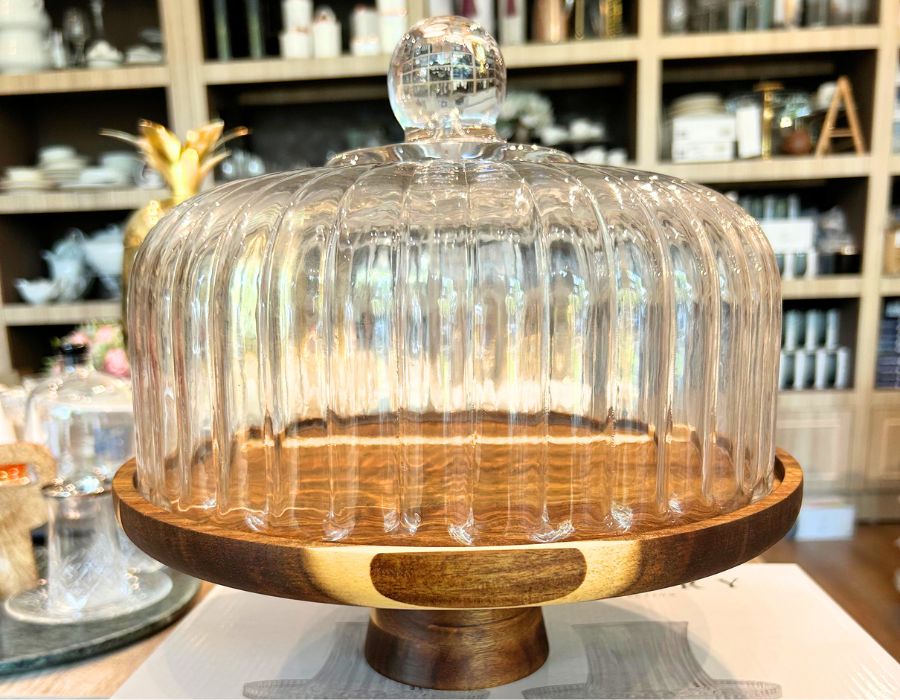 SINEM Kuchenplatte Tortenplatte auf Fuß 29cm mit Deckel Modell: SINEM Durchmesser: 28,5 cm GesamtHöhe: 29 cm Material Deckel: Glas Material Platte: Holz Marke: EASY