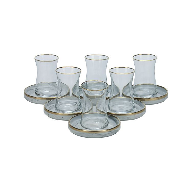SENS Elegantes Teeset 6 Personen Set 12-teilig 6 Teegläser 170 ml (Ohne die Teelöffel auf dem Foto) 6 Untersetzer Farbe Untersetzer: Weiß mit vergoldeten Bordüren Pasabahce Gläser mit vergoldeten Bordüren Marke: Bricard Porcelain Modell: SENS Material: Porzellan und Glas